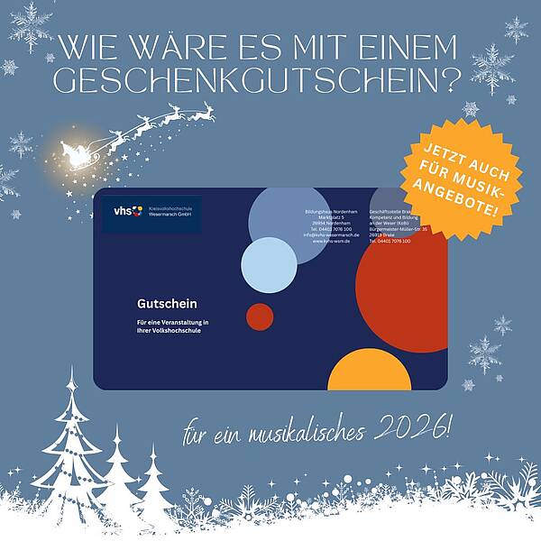 Sie möchten etwas sinnvolles verschenken? Wie wäre es mit einem VHS-Gutschein über einen Geldbetrag Ihrer Wahl? Damit schenken Sie Vielfalt pur. In unserem umfangreichen Programm ist für jeden Geschmack etwas dabei - egal ob berufliche Fortbildung, Gesundheit oder Hobby. Wenn Sie bereits genau wissen, welchen Kurs Sie verschenken möchten, können Sie auch einen Gutschein für einen bestimmten Kurs verschenken.